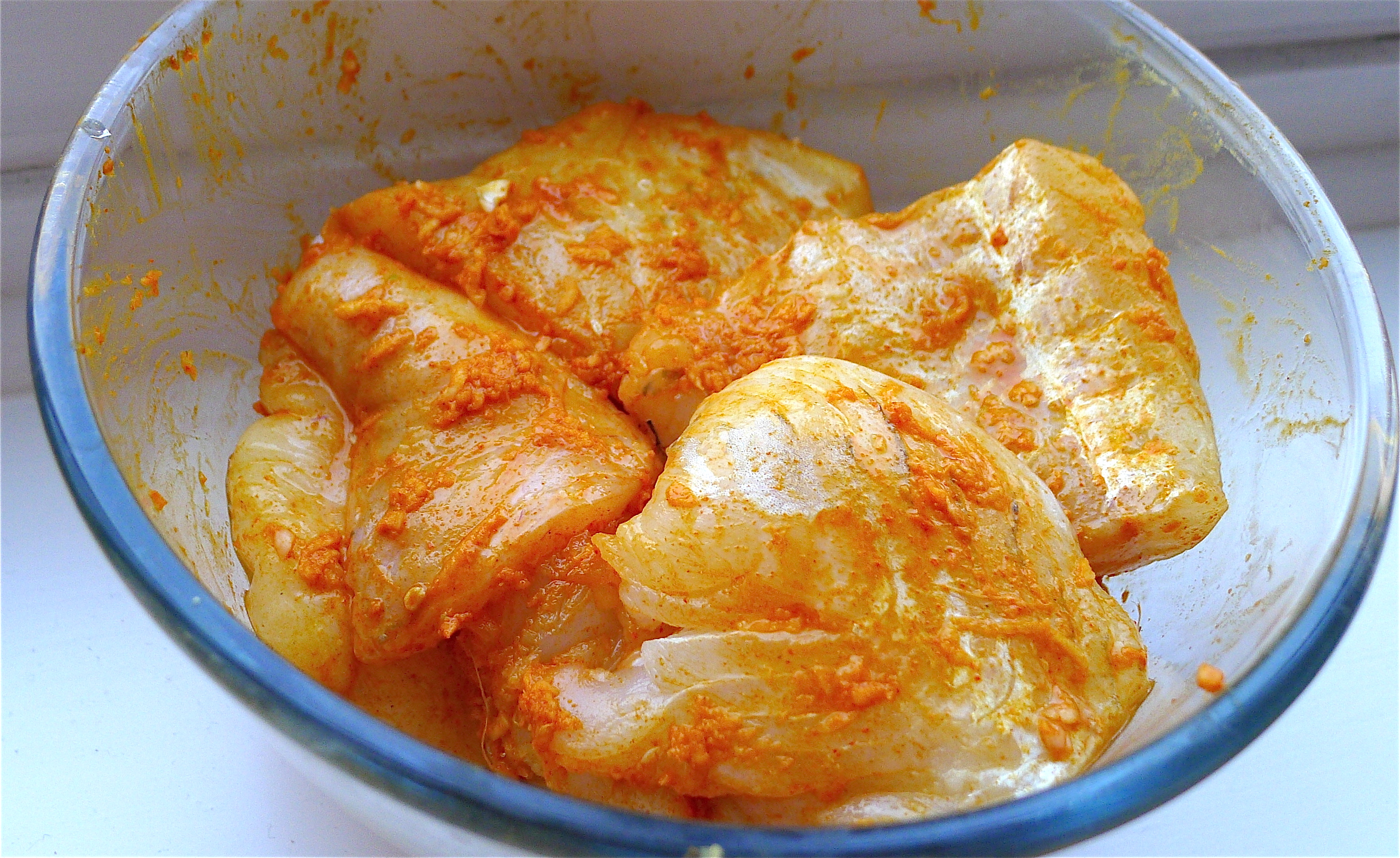 Make a few light cuts in the fish to let the marinade seep in. Combine the marinade ingredients and add the fish. Mix well, ensuring all the fish is covered. Cover and refrigerate for at least 30 mins, but overnight is best.